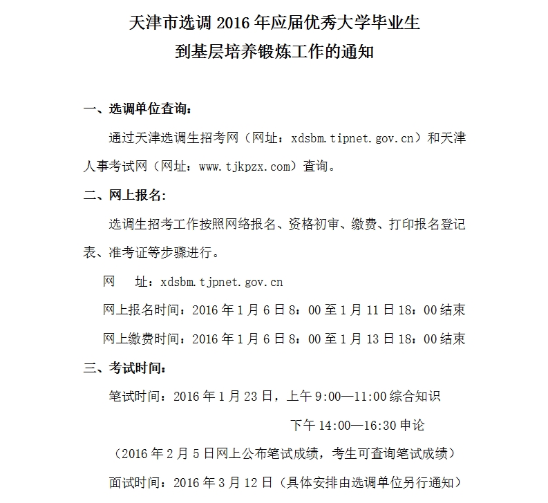 天津市选调2016年应届优秀大学毕业生 到基层培养锻炼工作的通知