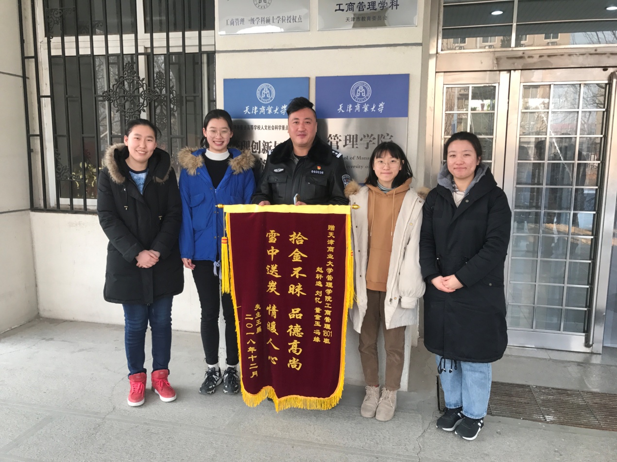 12月28日晚,伟德国际victor1946工商管理类1801 班赵轩逸、刘忆、董金玉、冯源四名同学,在校外乘坐出租车时捡到一个皮包,内有证件、银行卡等贵重物品及近1万元现金。返校后,她们立即报警,将拾到的物品原样交给佳荣里派出所。当晚11点多,警方联系到失主,并将物品奉还。