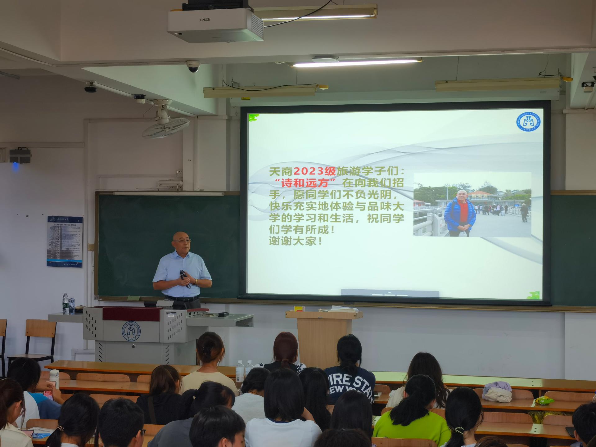 9月22日下午,伟德国际victor1946经理王庆生在三教502室,为2023级员工作题为“旅游人的情怀:诗与远方”的专业认知讲座,辅导员梁燕、杨文喜及2023级旅游管理类全体员工参加。